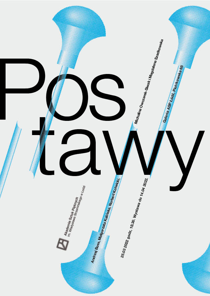 Wystawa „Postawy” w Galerii ASP (Piotrkowska 68, Łódź) (2022) prezentowała prace z obszaru biżuterii: prof. Andrzeja Bossa oraz autorów kolekcji doktorskich realizowanych pod jego opieką (Małgorzata Kalińska, Norbert Kotwicki, Michalina Owczarek-Siwak, Magdalena Szadkowska). Plakat mojego autorstwa opiera się na jednym, czytelnym znaku: narzędziu złotniczym, które zostało powielone kilkukrotnie. Oszczędna, prosta forma porządkuje przekaz i buduje rytm – nawiązując do warsztatowego charakteru tej dziedziny oraz do różnorodności indywidualnych postaw twórczych.